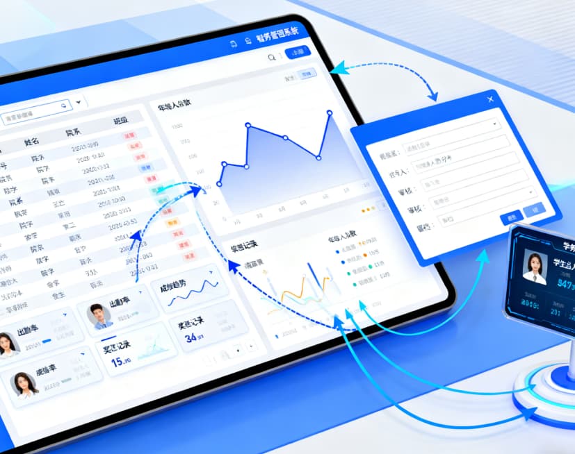 通过平台,管理者可实时监控全校整体运行态势,涵盖教学、后勤、考务等关键领域。系统能够自动汇总并可视化分析考勤/请假数据。