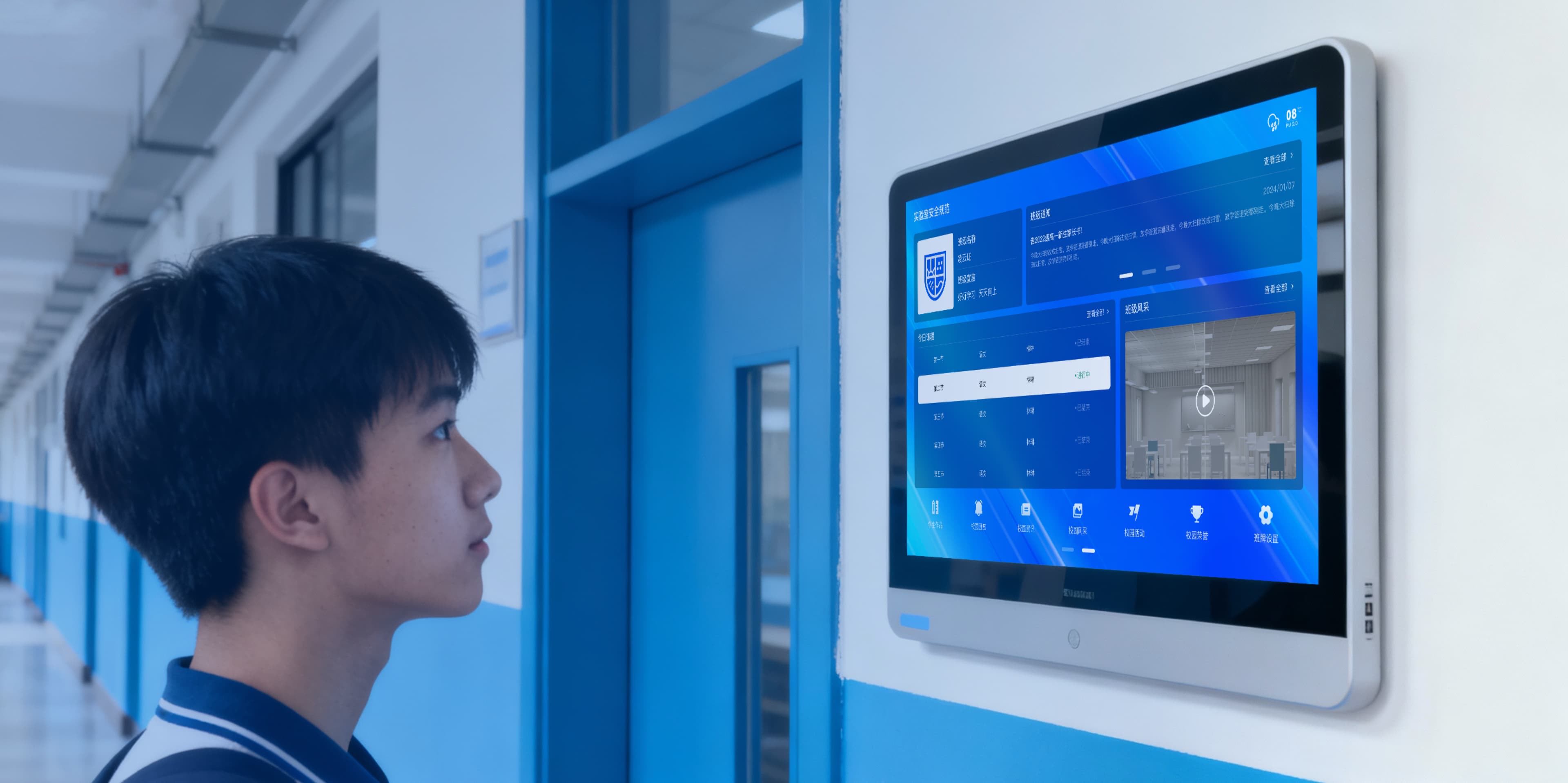 一款基于安卓系统开发的多尺寸(10.1/15.6/21.5/32英寸)智能壁挂终端,用于班级信息展示、学校通知公告、日常课程安排、人脸考勤签到以及家校互联。